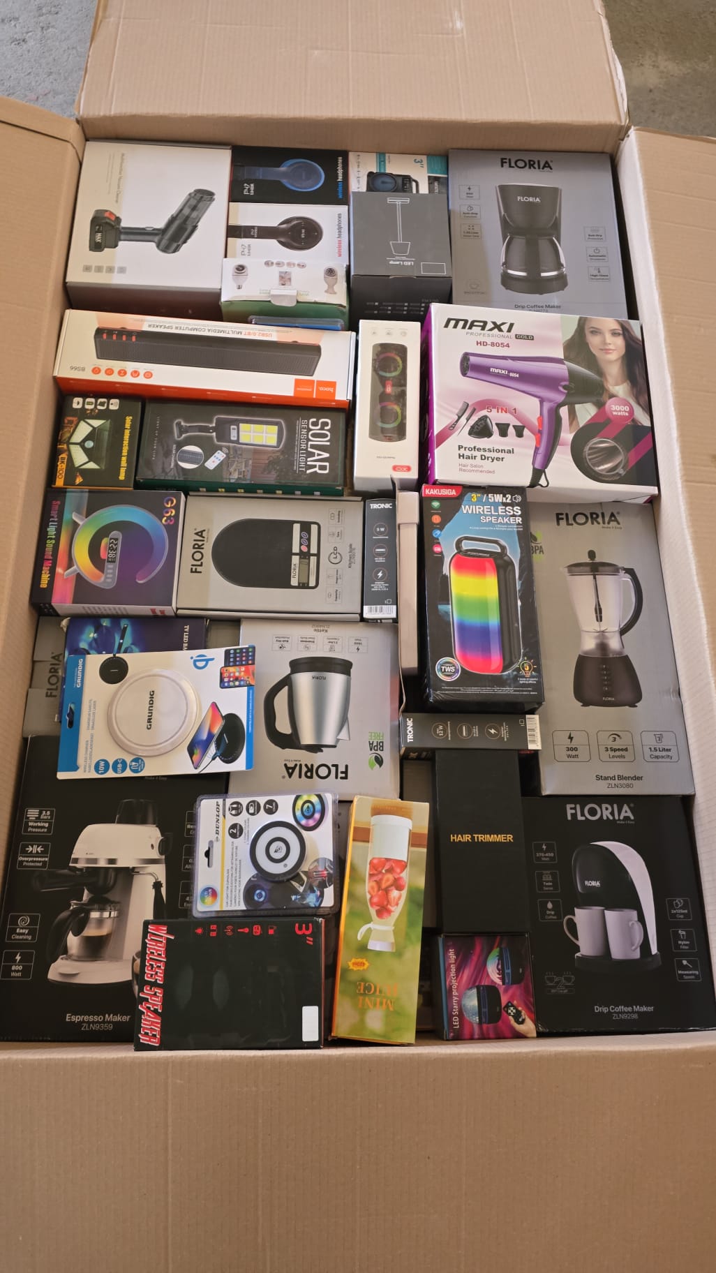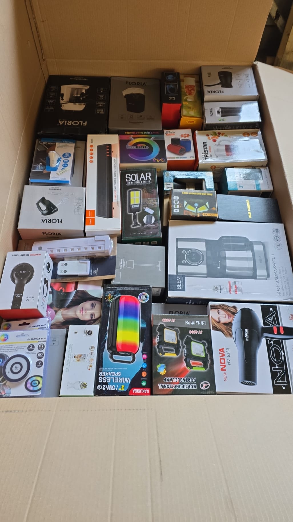 Paletii contin doar produse noi , electrocasnice ( fierbatoare, mixere, blendere, aparate cafea, aspiratoare, etc) si produse multimedia ( boxe portabile, casti, camere , etc), lampi solare. Dimensiune palet 120x80x50